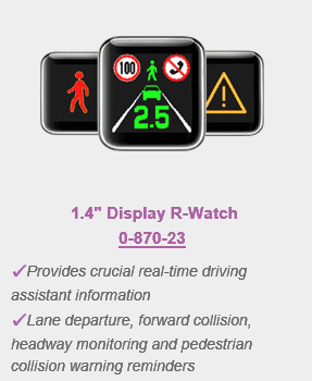 This 1.4" Display R-Watch is compatible with 0-870-21 ADAS Camera and provides crucial real-time driving assistant information. Benefit from information such as: lane departure, forward collision, headway monitoring, and pedestrian collision warning reminders.