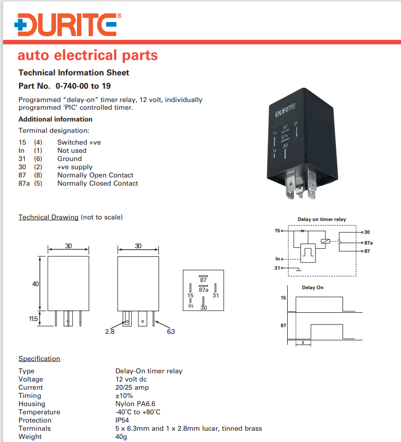 Suitable relay sockets are Durite numbers 0-729-00, 0-729-02 & 0-729-05