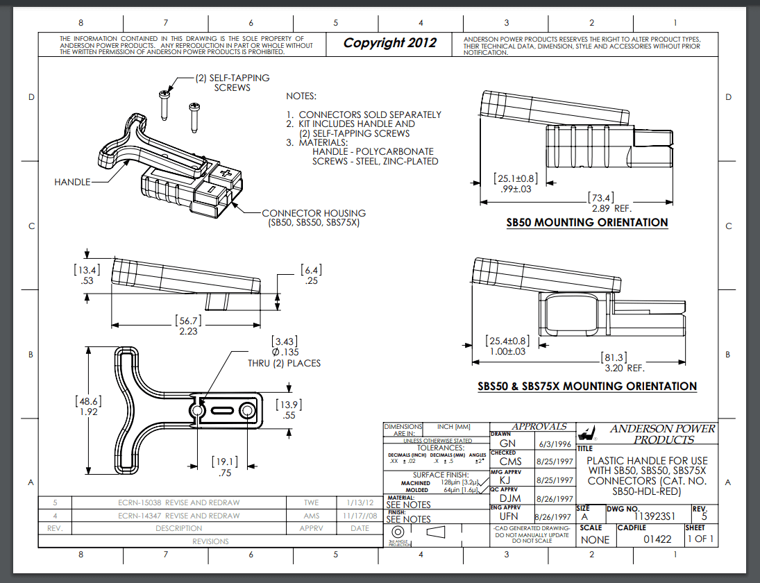 Handle to attach to ANDERSON SB-50 connectors to facilitate connection and disconnection.