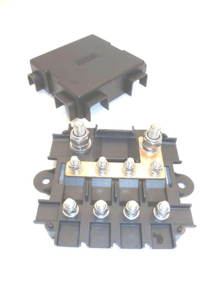 Designed to accept a 1 x MEGA fuse which can then be fed into up 4 x MIDI fuses thereby creating a high power distribution unit within a compact unit.